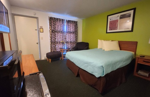 This hotel room with 1 queen bed is located at Pinebrook motel Lake George.