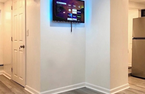 Located in the lower level basement of a residential home. Guests can relax on the living room couch and enjoy a variety of apps on the Roku TV.