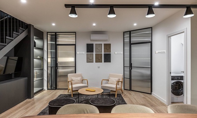 The space, on two different floors, boasts a sublime and coosy decoration, also having common areas such as a large living room, a huge kitchen with its dining room and laundry room.