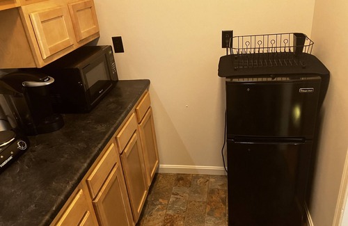 The kitchenette has a sink, ample cabinet space, and all necessary appliances and conveniences: refrigerator with freezer, Keurig coffeemaker (ingredients provided), microwave oven, bowls, plates, silverware, pots, pans, teapot, and hotplate.
