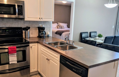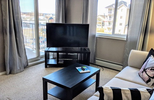 Newly Furnished 2 bdrm/2 bath condo equipped with is equipped with towels & linens, bath & shampoo, laundry, high speed internet and cable TV (50" 4K). You won't find a better location to stay in Stony Plain!