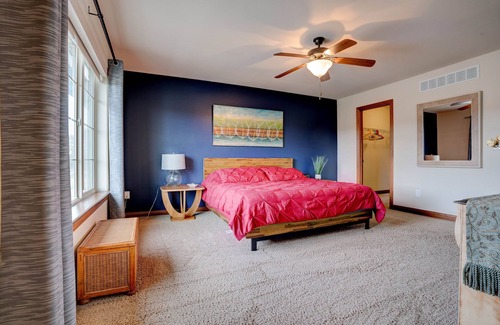 The large master bedroom boasts a plush king sized bed, walk in closet, and private bath!