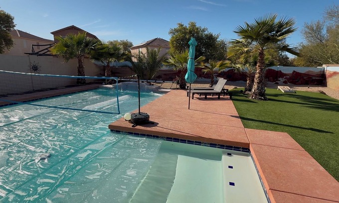 Located in Maricopa, this house is a great getaway, easy in and out access and you’re going to love the back yard! With 4 bedrooms including 1 king bed, 1 crib, 4 twin bunk beds, and 2 queen beds, guests will have plenty of space to relax. The property also offers amenities like a washer and dryer, AC, WiFi, and heating. Heated pool with basketball hoop and volley ball net make a great place for the whole families to play and relax. Corn hole boards on the turf, and pickle ball courts across the street will keep you busy! Our wonderful house will help you feel at home while you're traveling in Maricopa. Ak-Chin casino is less than 5 minutes to the south, with movies, bowling, arcade, and gambling.