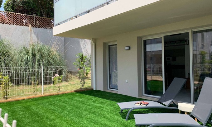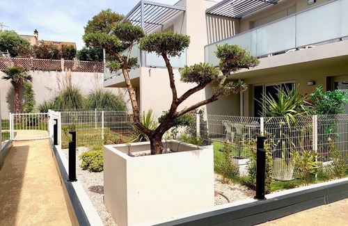 LE MARINEO I (4 people (child, baby included) On the ground floor of a luxury residence located close to the beach, the sailing school and the port of MEZE, beautiful comfortable apartment. A beautiful living room with equipped American kitchen (dishwasher, washing machine, ceramic hob, oven, extractor hood, microwave, fridge / freezer), a living room with a 140 cm sofa bed + TV and a dining area . The whole giving access to a small garden with terrace. The night area includes two bedrooms. A bedroom with a 160 cm bed and a bedroom with 2 90x2000 beds -A bathroom with its walk-in shower. The toilets are separate. In the basement, private parking space. Elevator. Apartment very well located. Internet connection in the property. Ideal for family vacations. Animals are not allowed - NON SMOKING accommodation - Linen Not Provided. parties non authorized in the property.