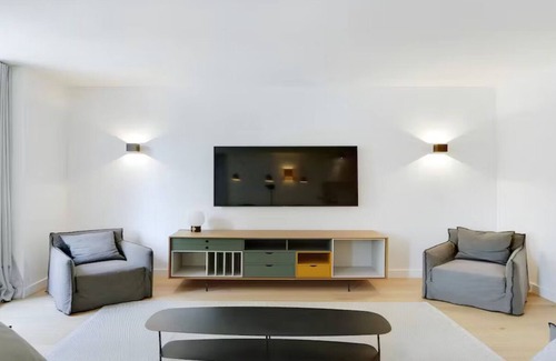Exploring the nearby shops and restaurants will undoubtedly provide an authentic Parisian experience, immersing guests in the local culture. All in all, it e a wonderful place to stay for anyone looking to enjoy the charm and vibrancy of the Saint-Germain-des-Prés district in Paris.This spacious apartment of 120sqm has been entirely remodeled to meet the needs of travellers and to offer a high standard set up. Including premium amenities such as wifi, smart TVs in each room, Queen and King size beds, plush towels, hotel linens, a fuly equiped kitchen with a washer/dryer, oven microwave and a dishwasher as well as air conditioning in all the apartment and a cosy sofa bed in the bright living room, this is the ideal place for a group of friends or a family !
