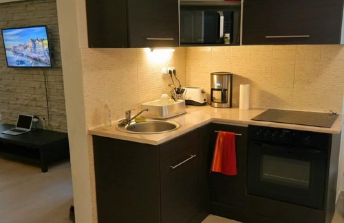 The apartment of around 70m² is on the ground floor of an apartment building and has a classy interior. The big living room provides a sofa with a Samsung 40” Smart TV (cable TV) for relaxing in the evening. The sofa can be used as a bed for two children (up to 12nyears old). The adjoining bedroom is furnished with two single beds that can also be joined together. The separate kitchen also adjoins the living room and is equipped with all the necessary utensils, a fridge-freezer, an electric stove, coffee machine and microwave. The big dining table invites you to enjoy meals and sociable gatherings. The modern bathroom with a corner bath, washing machine and WC rounds off the accommodation. Owing to the central heating, the apartment can be let out all year round. Wi-Fi is available free of charge. A pet is allowed free of charge.