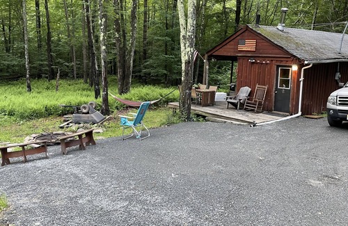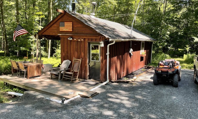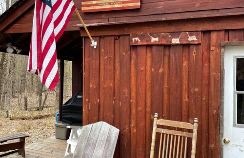 Nestled in the woods my rustic cabin sits on 104 acres in Delaware County NY. Abundant wildlife and fishing opportunities. There is a beautiful 18 hole public golf course just 5 miles away. We are also 9 miles from Oneonta NY and the same distance to East Sydney Dan and beach (which is a waverunner freindly reservoir and Sandy beach)