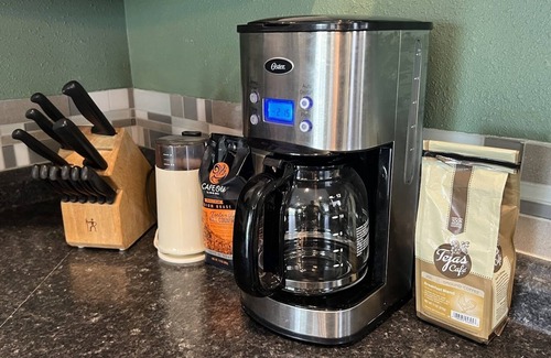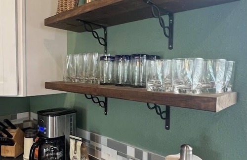 Fully equipped kitchen with microwave, coffeepot (& coffee + tea), toaster, full-size refrigerator, electric stove and oven, plus dishwasher (detergent provided). Laundry room has washer and dryer (detergent provided).