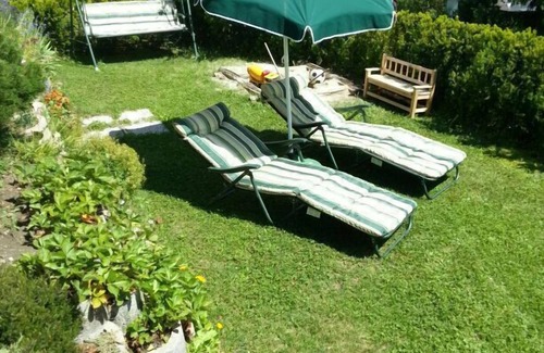 The apartment has a balcony with beautiful views and access to a garden with deck chairs, sand pit and trampoline.
