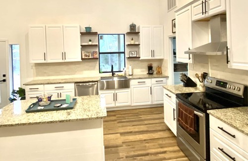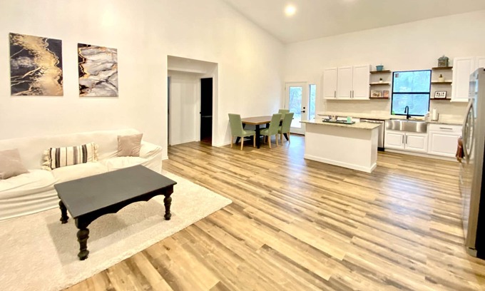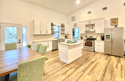 The kitchen is stocked with the newest appliances including an air fryer, Instant pot & blender. Next is the utility room with a washer and dryer for your use. To the left is the back door which leads out to a covered patio and hammock for your enjoyment.