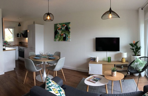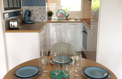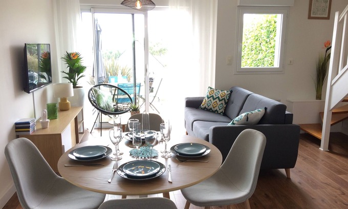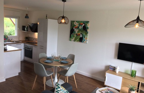 Come and discover this house which has just been tastefully furnished by modernity. The house is located in a private domain with access to the swimming pool in the months of July and August. You can enjoy the terrace and the balcony which are bathed by the sun most of the day. All the furniture is new and very good quality. The living room with the open kitchen opens onto a south-facing terrace. The parent bedroom is equipped with a king size bed of 160 with access to the balcony and the second bedroom is equipped with two single beds. You with a second toilet upstairs with the bathroom. Possibility of having sheets for a package of € 10 per bed