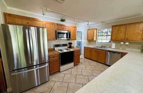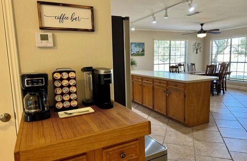 KITCHEN: Fully equipped kitchen w/ dishwasher, 6-person dining table, counter dining, drip coffee maker w/ filters (coffee not provided), Keurig coffee maker (Keurig pods provided), utensils, cookware, and full-size refrigerator/freezer with filtered water dispenser and ice maker.