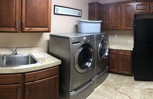 There is a space for everyone to socialize or get away from it all! Head up the open staircase with wrought iron railings to the Bar Loft/Man Cave. This is a great space to enjoy a sports event or movie on the 65-inch flat screen SmartTV while making drinks behind the granite wet bar with stainless steel mini-frig. Get in a quick workout on the Smooth Fitness elliptical. Right off this room you can enjoy the balcony in the morning with the cup of coffee watching the sun rise over Four Peaks or in the evening sipping on a glass of wine watching the sun set behind Pinnacle Peak. This balcony also looks over the pool and putting/chipping greens. It’s a spectacular site at night with the professional landscape lighting.