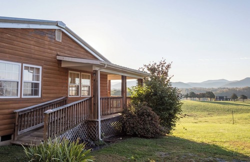 The Wild West Cabin is one of two non-connected duplex cabins. This cabin features one bedroom with a queen bed, one bathroom with a shower & jacuzzi tub, fully equipped kitchen, comfortable dining and living space, flat screen cable TV and Wi-Fi. Linens and kitchenware are provided. It has a covered, wrap-around porch with rocking chairs and stunning views of the property, as well as an outdoor common area with fire pit and gas grill. Propane and firewood also provided.