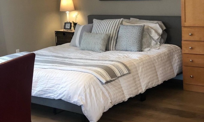 Studio Apartment: Open floor concept, Premium, Luxury foam King bed (Medium firm), full kitchenette with two sinks and bathroom (toilet, individual-sized/small shower only-no sink in bathroom). FRESHLY remodeled. Memory foam futon sofa turns into double bed. Small single shower.