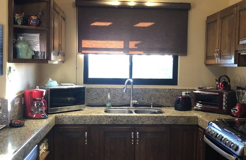 The casa is equipped with all new appliances. Kitchen area has granite countertops and all new small appliances. Separate laundry room with new full-size washer, dryer and storage pantry. From the living room area you have distant view of the Bay of La Paz/Sea of Cortez, the beautiful ever changing desert and the city night lights of La Paz. The smart TV allows you to connect to WiFi and Netflix. There are also HDMI ports. There are various books, puzzles, cards and games available to play as well. The outside back area has a full length tiled patio with a covered seating area. Patio table/chairs and lounge chairs compliment the patio. The heated pool is about 5 1/2 ft. deep with a shallow "Baja Shelf" ledge as well as easy steps in and out of the pool.