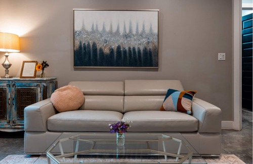 The Stellar House, the heart of The Liney Moon, is a 4 bedroom/4 bathroom house that is perfectly placed in the middle of the property. The massive open concept common area is the perfect place to gather indoors with a huge sectional couch facing the large flatscreen tv over a linear fireplace. The spacious and recently upgraded kitchen has a huge island and is fully equipped with two refrigerators, two ovens, and two cooktops, plus all of the essentials needed to prepare a meal for a large group. The back patio was designed with celebrations in mind with a huge covered patio with large farm tables and event tables/chairs that can accommodate events up to 150 daytime guests! Additionally, the event area comes with a gas grill, bar with stools, outdoor flatscreen TV, swimming pool, yard games, fire pit and more. The Stellar House includes a master suite with a luxurious master bath, two bunk-room suites each with two custom-built, super fun queen bunk beds and on-suite bathrooms, and a fourth bedroom with twin bunk beds (and an adjacent bathroom) perfect for the little ones.