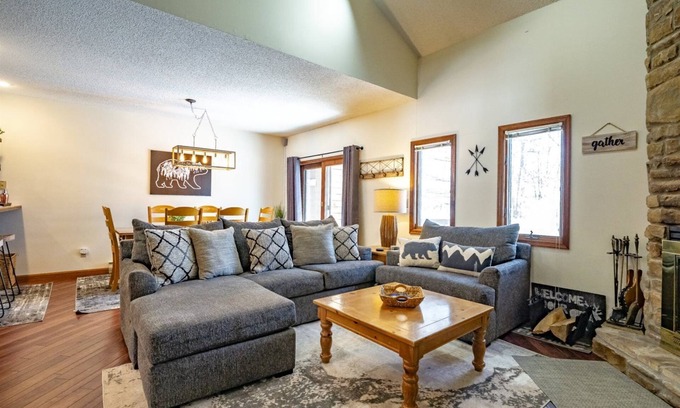 Inside, the home is warm and welcoming, with contemporary furnishings and a relaxed, inviting atmosphere. The open main level features a comfy living area with a wood-burning fireplace, a dining space for gathering, and a well-equipped kitchen that makes mealtimes easy and enjoyable. You’ll also find a convenient half bath and laundry area on this level, adding extra comfort to your stay.
