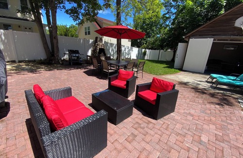 Three bedrooms, 2 bathrooms completely renovated home. Sleeps 6. One full bath, one half bath. New outdoor shower. Fully renovated. All bedding freshly washed and beds made, towels, 6 beach chairs and 6 plush beach towels are included. Washer and dryer on main floor. large air conditioned barn- also renovated- with refrigerator, television, ping pong table, dart board, WIFI, table and chairs and work station with charging outlets. One block from the center of Greenport Village. Walk 9 blocks or drive to Fifth Street beach-no permit required. Guest beach permits available with a 2 week booking-as per town requirements, Please let us know in advance. Walk to shops, restaurants, waterfront and carousel. Short bike ride or car ride to vineyards, beautiful trails and other North Fork towns. Around the corner from the supermarket. Front porch with rocking chairs. Sip your morning coffee and enjoy! Front yard is fully fenced. Backyard is fully fenced as well. Sun drenched backyard has an outdoor fireplace ( great for roasting s’mores!) , large brick patio new Weber barbecue, all new-table and chairs, chaise lounges and a bike rack. Add flavor to your food from our herb garden. Enjoy dining outdoors! Kitchen is equipped with unbreakable plates and glasses for outdoor dining . Our renovated barn has AC, WIFI, TV, fridge, seating, dining area, work station and games. The renovated kitchen is fully stocked with pots, pans, gadgets and small appliances . The house has a new washer and dryer next to the kitchen and newly finished hardwood floors. There is WIFI, board games, playing cards and a fireplace. New appliances and granite counters in the kitchen and bathrooms.