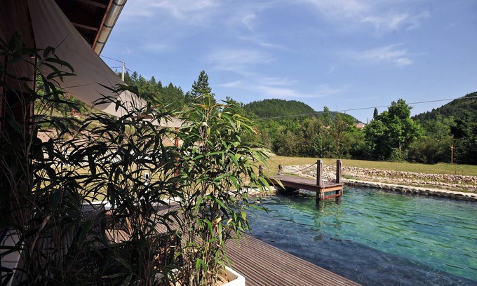 We offer for rent 3 living spaces - Simplicity, Elegance and Natural - with terrace and direct access to the natural pool (14X7m) continuously fed with spring water and filtered by plants.