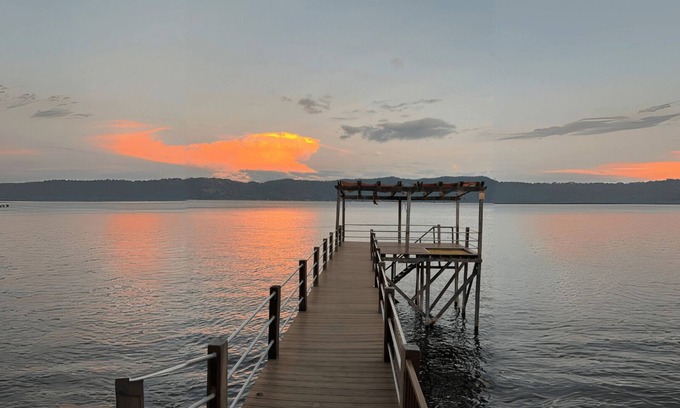 Cozy house in Lake Coatepeque, Quinta Sunset has a spectacular view of the lake from its terraces. It also has three bedrooms and a cabin. The master bedroom has a lake view and inside the house: living room in the bedroom area, two full bathrooms, fully equipped open concept kitchen and barbecue. Parking for 3 vehicles, terrace and dock.
