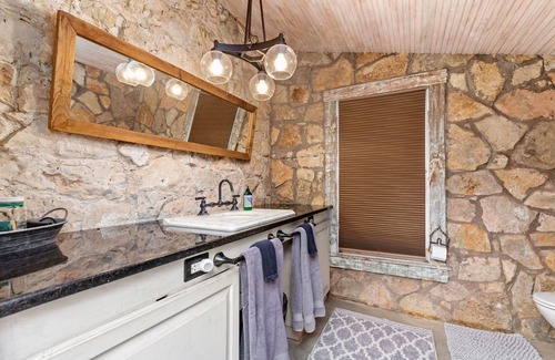 Cozy, historic, rock cottage, 240 sf. Huge front deck. Old hardwood floors, vaulted tin ceiling. Mini kitchen-farmhouse sink, tiny fridge, coffee, toaster. Modern mini-split heat pump cools, heats. Wood-burning stove adds a cozy, romantic touch. Back deck has views of pasture and horses. Set on 7-acre ranch. Quirk Alert! Bathroom is accessed outside front door 25 paces to back of cottage. Open shower for two. Rain shower head and wand. Exposed rock walls, concrete floor. No chemicals used so critter sightings possible.