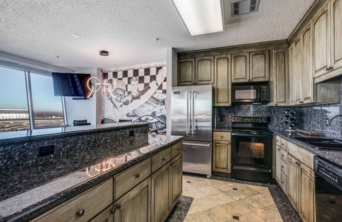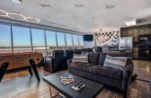 The best seats for watching race day action at Texas Motor Speedway, at Lone Star Tower, in Fort Worth. This condo, in upscale gated high rise, comes with panoramic views of the entire track via a floor-to-ceiling angled glass wall in the living and dining area.