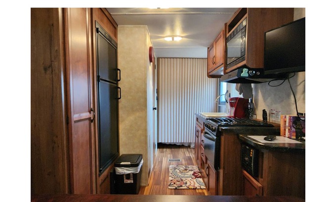 You'll always remember your time at this unique place to stay. Tucked away by the barn, this RV allows you to be able to see the cattle, squirrels, opossum, deer, and maybe a wild hog as you relax sitting in the yard or looking out the windows in the dining area.