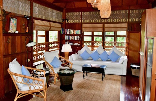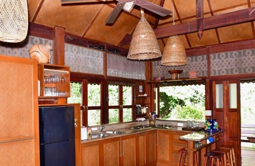 This wooden Thai-style house sits on stilts. The main living areas are upstairs, consisting of a master bedroom, living room (with a sofa that can be turned into an extra bed), kitchen area with bar stools, 1 1/2 bathrooms ‘open to the sky' and two large decks connecting all upper-level living areas. Downstairs, on the ground level, there is a guest suite with portable air-con, another bathroom and a wet bar. Baan Daya is priced for 4 people