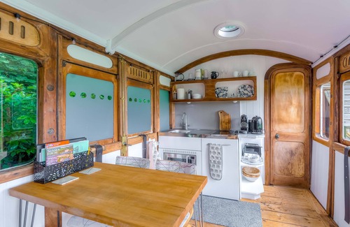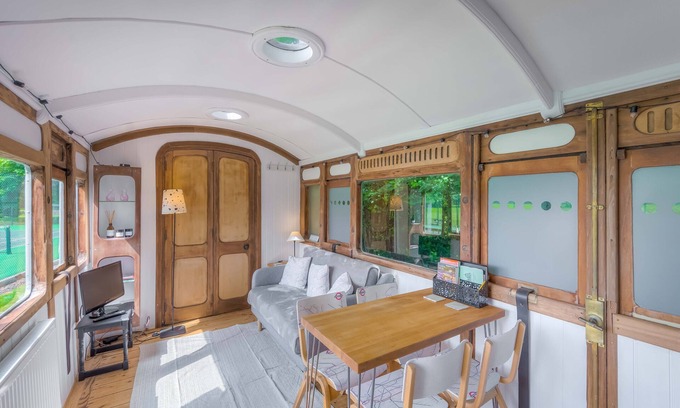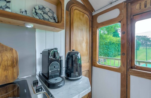 The railway carriage is situated well away from the road in a tranquil and beautiful spot next to the tennis court in the garden, and adjacent to National Trust woods. The carriage is also located close to pony paddocks and stables on the other side of a fence so will appeal to horse lovers - but if you are allergic to horses or their environment this probably isn’t the place for you!