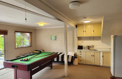 This is a basic, old-school Kiwi bach—no frills, just the way we know and love. It comfortably sleeps two families and is set in a quiet neighbourhood, just a short walk across the road to the lake and swimming at Rainbow Point, or a little further to Wharewaka—a favourite local swimming spot!
