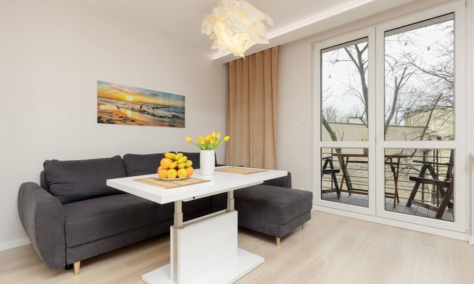 This comfortable flat can accommodate 4 people and has an area of 39 m². It will be an ideal choice for families and groups of friends. The flat consists of a living room with a kitchenette, a separate bedroom, a bathroom and a furnished balcony. It has a unique décor in pleasant light colours, with wooden elements. This will make our guests' stay relaxing and enjoyable. The living room is a spacious interior with a comfortable sofa bed, a table with chairs and a coffee table. It is connected to the kitchenette, which is fully equipped for preparing meals. Amenities such as a dishwasher, oven and microwave are also available. A table and chairs will allow you to dine comfortably with the whole family. The separate bedroom is furnished with a stylish double bed and a roomy wardrobe. A balcony with garden furniture leads out from the living room. There is a table and chairs where you can enjoy your morning coffee while admiring the beautiful views. The cosy bathroom has a bathtub, toiletries, towels and a washing machine. Fresh linen is of course provided in the flat. The multimedia facilities of the flat include a SmartTV and WIFI internet access.