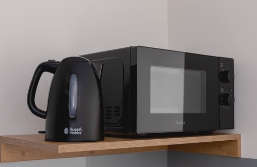 Fridge with freezer, induction hob, microwave, electric kettle, glasses, cups, set of dishes, cookware, cutlery, frying pan, bar stools