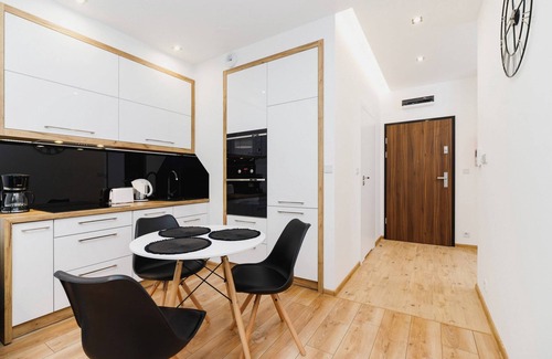 This fully equipped apartment can accommodate up to 4 people. It consists of a living room with a kitchenette, a separate bedroom and a bathroom with a bathtub. The décor of the interior successfully combines warm wooden elements with minimalist modern furniture, creating a space that is both inviting and stylish. All elements of the apartment work together to guarantee the maximum of comfort. On the balcony fitted with furniture guests can relax while enjoying views of the nearby greenery. Relaxation time in also possible by more modern entertainment: the apartment’s multimedia include a flat-screen TV with internet access and a free WiFi connection. Other amenities include a wide range of kitchen and bathroom appliances (a washing machine, a coffee maker, a hairdryer) and a welcome package of bathroom cosmetics set, towels and beddings.