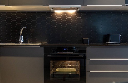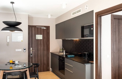 Each apartment provides a kitchenette with a refrigerator, an oven, a stovetop, and a microwave. Guests can appreciate conveniences like an electric kettle and a dishwasher, and other amenities include free WiFi and a Smart TV.