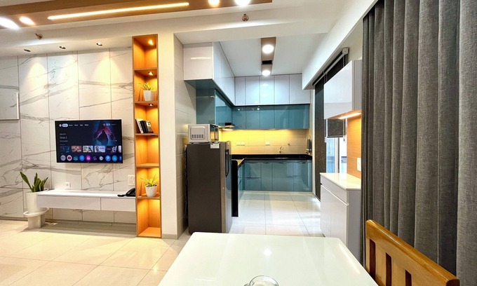 A fully furnished service apt at Sobha Dream Heights at GIFT city: area 1150 sft, 2bhk, central AC, geyser, sofa, beds, tables, fridge, TV, washing machine, bedsheets, towels, full kitchen, one 4 wheeler parking, EV charging, CCTV, swimming pool, club house (for long stay- min30 days), home cooked food option also available. We also clean the apartment every other day. https://maps.app.goo.gl/YKGvhMBj2wwq5CF27