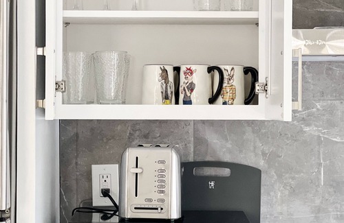 Bond over delicious meals in the fully-equipped kitchen located conveniently on the first floor. The kitchen boasts all the essentials you'll need, including a stove, oven, refrigerator, microwave, coffee maker, and a full set of dining ware and silverware.