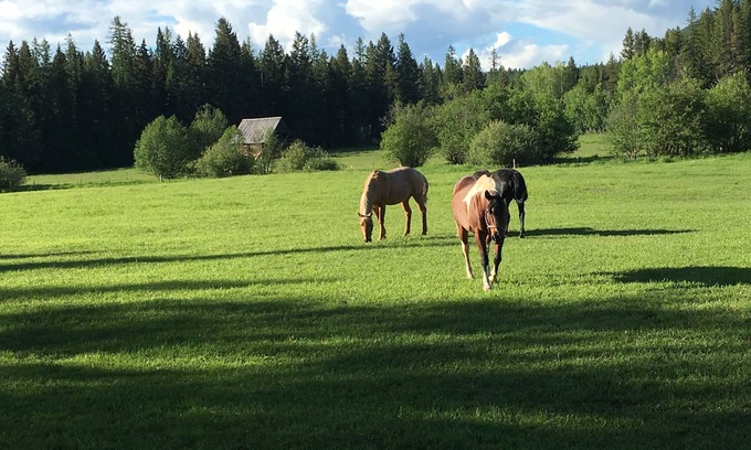 To the West of the Ranch house is forest and wilderness. We have many trails in these woods and will gladly take you on the trails or provide you with a map. In no time you are among giant cottonwood trees, grand firs, larch, alder, brush and game trails. You may catch a glimpse of an elk, deer, moose or even a bear. We do provide bear spray and our dog for those who want. His name is Togo: he is part Karelian Bear Dog, Australian Shepard and full on joy. He has three buddies: Thor (Norwegian Elk Hound), Nova (corgi), and Oso (large mutt). All of them are very friendly, neutered and know the turf. They like to go with guests on the trails and will often show you the way.