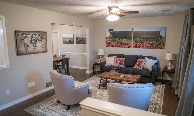 NEWLY RENOVATED, RARE 4 Bedroom ranch near ARK Encounter. No Steps. Nice neighborhood. Extremely comfortable beds. (same beds we own personally) Plenty of space for your group and/or share with multiple families. Enjoy a complimentary, fully stocked, coffee/tea bar that includes to-go cups! Only 1 mile from restaurants, groceries, gas, etc. Enjoy a spacious 1/2 acre flat yard to relax after your trip to the ARK or Creation Museum. Looking for a smaller space? Owner also owns The Paris Street House. Link: https://www.homeaway.com/vacation-rental/p4839499