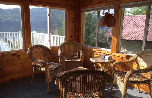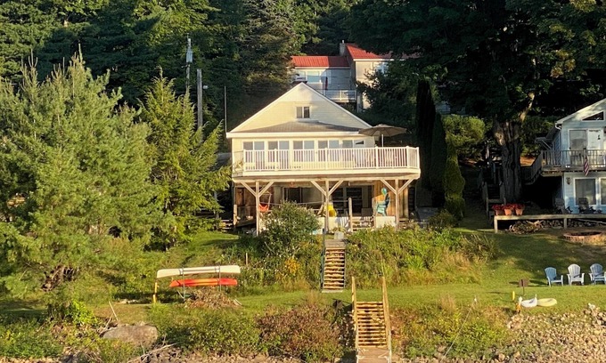 So many opportunities to enjoy your home and its ideal setting. Walk down the terraced lawn and a dozen steps and you're in the water. Wade in at the waterline, or jump off the deep water dock. Go for a paddle in the two kayaks or a row in the dinghy provided for your use. When you want to dry off, relax on the dock, lawn, or on the large upper deck that all bask in full sun exposure most of the day. Read a book in the shade of the expansive lower level, open-air porch. On both levels, enjoy completely unobstructed views of the water and Adirondack foothills beyond. On crisp Adirondack mornings, turn on a little heat and enjoy your coffee on the enclosed porch dining area that bathes in warm breakfast sunshine. On the rare, too-hot day, enjoy the all-day shade of the lower-level porch or cool off in the living room in the comfort of air conditioning. Have a big family? Split up, with some downstairs and some upstairs, each with their own fully-equipped kitchen.