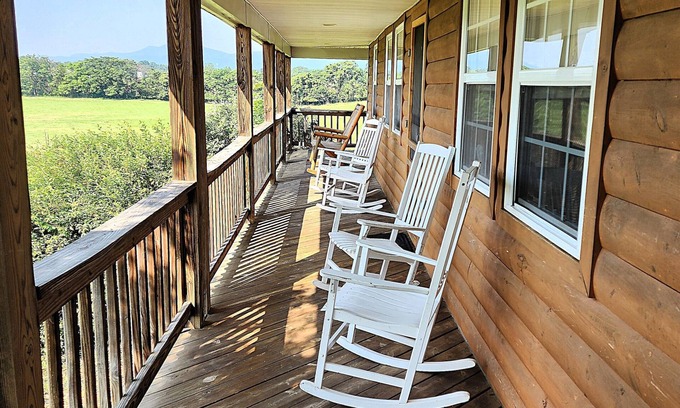 The largest of our cabin suites, the Lodge sleeps up to 8 guests with three bedrooms and two full baths, including a master with a jacuzzi tub. It features an open-concept living area, fully equipped kitchen, dining table for six, flat-screen cable TV, WiFi, and is the only unit with a washer and dryer. Enjoy mountain views from the covered wrap-around porch with rocking chairs. Linens, kitchenware, firewood, and propane are provided. Guests also have access to a shared outdoor area with fire pits and a gas grill.