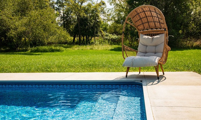 The pool is always heated and gradually steeped toward a deep end. It offers plentiful areas to lounge and let the day melt away. Sorry, pets are not welcome in the pool, but pooches can have their fun in the sun swimming in the gorgeous natural pond. Shared with homeowners and guests in the other camper on the property (should it be rented during your stay).