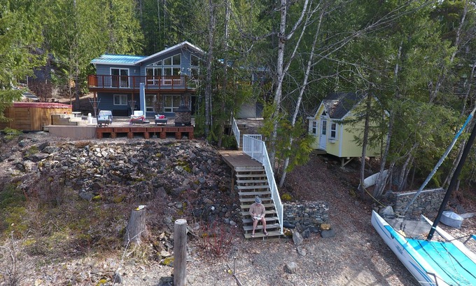 Welcome to one of the nicest waterfront homes on the the Shuswap Lakes! This 5 bedroom, 4 bathroom walk-out oasis sits on the shores of the crystal clear waters of the Shuswap Arm in one of the best locations. Located in the private, gated community of Cinnemousun Beach Properties, this property has it all. There are four large bedrooms in the main house and an additional fully independent guest cabin above the double detached garage. Inside the main house you will find all the comforts of home with a beautiful designer kitchen and modern appliances. The Master Bedroom has a gorgeous ensuite and a walk-in closet. The main floor guest bedroom has a set of twin-over-double bunkbeds. On the lower walk-out level you'll find two more good sized bedrooms with queen beds. Also on the lower level there is a great indoor entertainment space with a wood burning fireplace, ping pong/pool table and a great home theatre set up with a wide selection of movies. A high efficiency laundry pair are available here as well. Out front you will be blown away by the large deck with a fireplace, and large, luxurious hot tub. There is a two level kids playhouse and outdoor games. You'll have access to a buoy and a large dock with it's own boat slip. Both kids and adults will have fun on the attached slide and diving board! Everything you'll need and more is waiting for your arrival. You'll have access to floaties and water toys, kayaks, a 16 foot Hobie Cat and more. Just bring your toothbrush and you be all set for one of the best vacation experiences of your life!