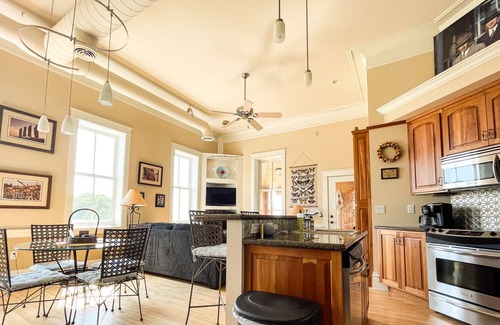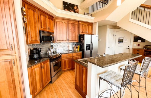 The condo's living room has ample comfortable seating organized around the fireplace. Adjacent to the living area is the dining table with seating for four. There's also bar stool seating at the kitchen island. We especially love how much light comes in through the windows that extend the length of the unit's great room.