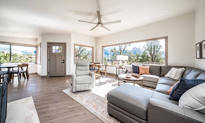 Red Rock Rhapsody in Uptown Sedona excites and entices with its inspiring views of the majestic red rocks which can be enjoyed from panoramic picture windows or from the wrap-around stone pathway which leads to two large patios. The patios are each well-equipped for relaxing and absorbing the beauty, power and peacefulness of the ancient monoliths. A multitude of hiking trails are nearby. Enjoy this charming yet totally renovated (2021) 3-bedroom, 3-bath ranch home which retains its vintage charm yet features all modern conveniences, including a fully equipped kitchen (with a gas range) sure to please serious cooks.