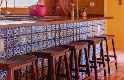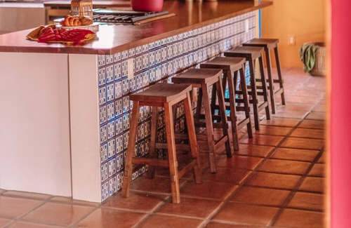 Get ready to fall in love with this charming home from the moment the doors open into the open-concept great room. Bold interior design choices bring this space to life, from the terracotta tile floors to the exuberant wall colors, it creates an inviting atmosphere. A comfortable living area off the entryway features a cozy sectional couch where guests can catch up with old friends or enjoy a night in with family. Continue into the updated modern kitchen with beautiful countertops and a 5-stool breakfast bar that offers the perfect spot for a casual meal. Plus, with a window framing the far-off mountain views and letting in tons of natural light—what’s not to love? An adjacent dining area seats 6 comfortably for a small dinner party. When it’s time to unwind, guests can choose from 3 dreamy bedrooms named after their primary color. The green room, or primary bedroom, boasts a king bed, private bathroom with a skylight, and French doors leading out to the pool. A pink room with a king bed and direct pool access is excellent for relaxing, while the blue room, or bunk room with a private bathroom, boasts 2 twin-over-full beds—great for kids or those young at heart. However, the pieza de resistencia is the backyard outdoor oasis. Unwind on comfortable loungers and soak up the sun while taking a dip in the private pool or gather around the firepit at night with friends and family to enjoy the warmth of the flames. For a truly immersive outdoor experience, dine alfresco under the shade of the roof or meditate on the side patio adorned with a tranquil waterfall spigot. This home has it all!