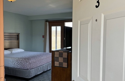 Redwood Inn & Suites Room #3 - Located conveniently almost exactly halfway between the area's two largest Youth Baseball Tournament Parks. Redwood is a great choice if you are looking to avoid the hustle and bustle, but still, only be a short drive to your games. Fully renovated recently, the Redwood is an impeccably clean privately owned, small motel that is can house your team or can offer just a single room. There is ample parking in front and a shared laundry room for the whole motel. Rooms 1 - 6 each have their own private access to the covered rear porch overlooking the lawn and cornfields beyond. This backyard space is a great place to unwind after a game, with plenty of grass to play catch and a gas grill and picnic tables to enjoy outside dining. In addition to the covered rear porch, there is a screened-in open-air lounge area available for all guests to enjoy. There are also three, 2-bedroom apartments (must be booked separately) with full kitchens available if you need a little more space than your traditional hotel room.