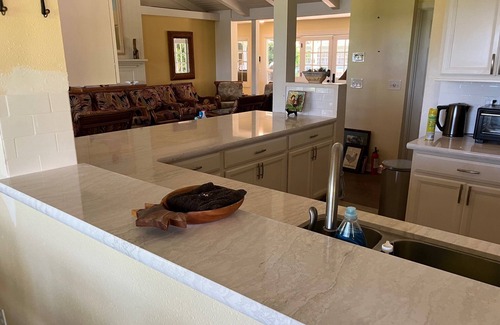 Anahola Beach House is large where it matters. Where your family and friends can spaciously spend time together. A huge 'great' area, where 20 people can comfortably share each others company in the Living Room, along with 4 bar stools perched at the large kitchen counter, with a dining table that comfortably seats 20 people, This is like coming home to the large 'plantation' house of your grandparents. A spacious home designed for your family and friends to 'not' feel like sardines. A grand old house, that when you enter, you know you're home and where relaxing is easy. A 'laid back' place and a rejuvenating and soul restoring jewel.
