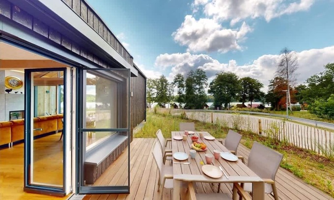 The dining area is furnished with a large table and a panoramic window offers a view of the lake. The house has two bedrooms for four people and a sleeping loft accessible via a small staircase with a further four beds. On the approx. 1,500 m² property, you will find a cozy seating area surrounded by greenery right next to the beach. A canoe and a rowing boat are also available.