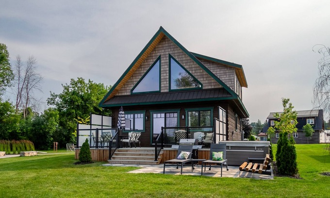 Regal Retreat is the perfect family getaway. Waterfront on the Trent River, this beautiful cottage was featured on HGTV’s Renovation Resort Season 1. The cottage sleeps 13 guests in 3 bedrooms and a flex loft space. Spend your vacation feeling like royalty relaxing in the private hot tub and on the private dock. Regal Retreat is on a private road with six other cabins that share a beach and fire pit. The cottage's large open concept kitchen will accommodate the whole family for shared meals and family game night. Regal Retreat is available for booking all year round.